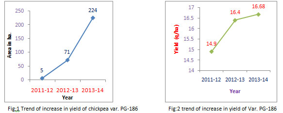 In Siddharthnagar chickpea area is increasing day by day. To meet the increasing demand of pulses, chickpea seed production programme was taken up by KVK Sohna, Siddharthnagar during 2010-11 with the help of Seed production Programme of NDUAT Kumarganj, Faizabad. Chickpea variety PG-186 grown at KVK farm in 2 ha area under late sown condition and produced 29 quintal breeder seed. Farmers visited the chickpea field and got impressed with the performance of crop in late sown condition. They have requested for seed. KVK conducted frontline demonstration on chickpea during 2011-12 in 5 hectare area using Var. Pant G-186 under late sown condition. Farmers achieved average yield of 14.9, 16.4, 16.68 q/ha seed yield during 2011-12, 2012-13 and 2013-14 respectively. Major achievement was that area under chickpea variety PG-186 had increased from 5 hectare to 224 ha within 3 years.