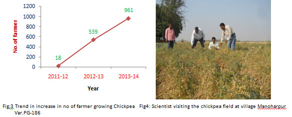 Fig : 3 Trend in increase in no of farmer growing Chickpea Fig4: Scientist visiting the chickpea field at village Manoharpur. Var.PG-186